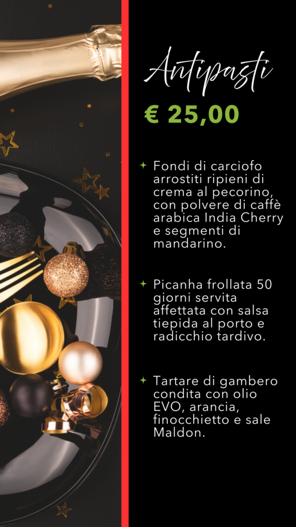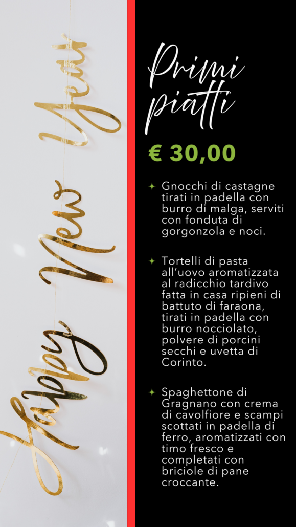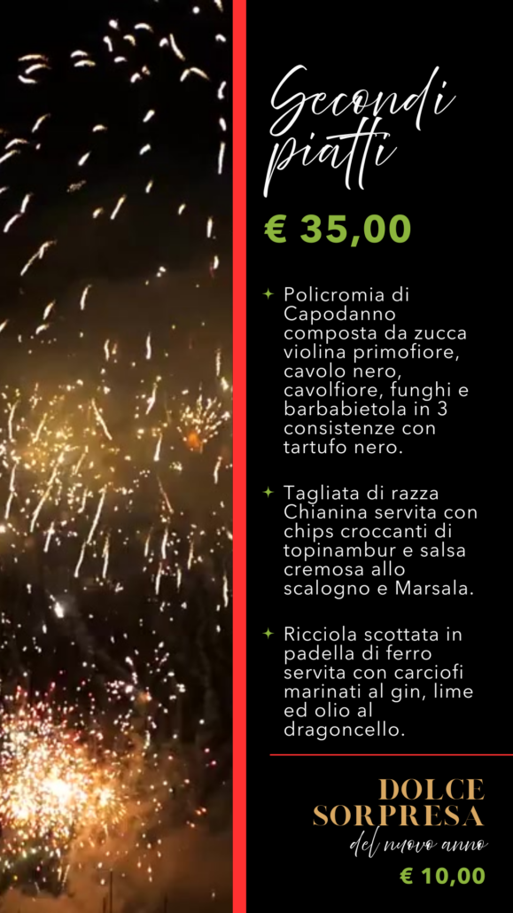 Un menù speciale, pensato per chi desidera iniziare il nuovo anno con un’esperienza culinaria memorabile, in un’atmosfera elegante e festosa. 🍾✨ culinaria. Lasciati coccolare dai sapori unici di ogni portata e condividi con i tuoi cari un momento indimenticabile. Prenota ora per assicurarti un posto a tavola e preparati a vivere un Capodanno all’insegna della gastronomia d’autore.